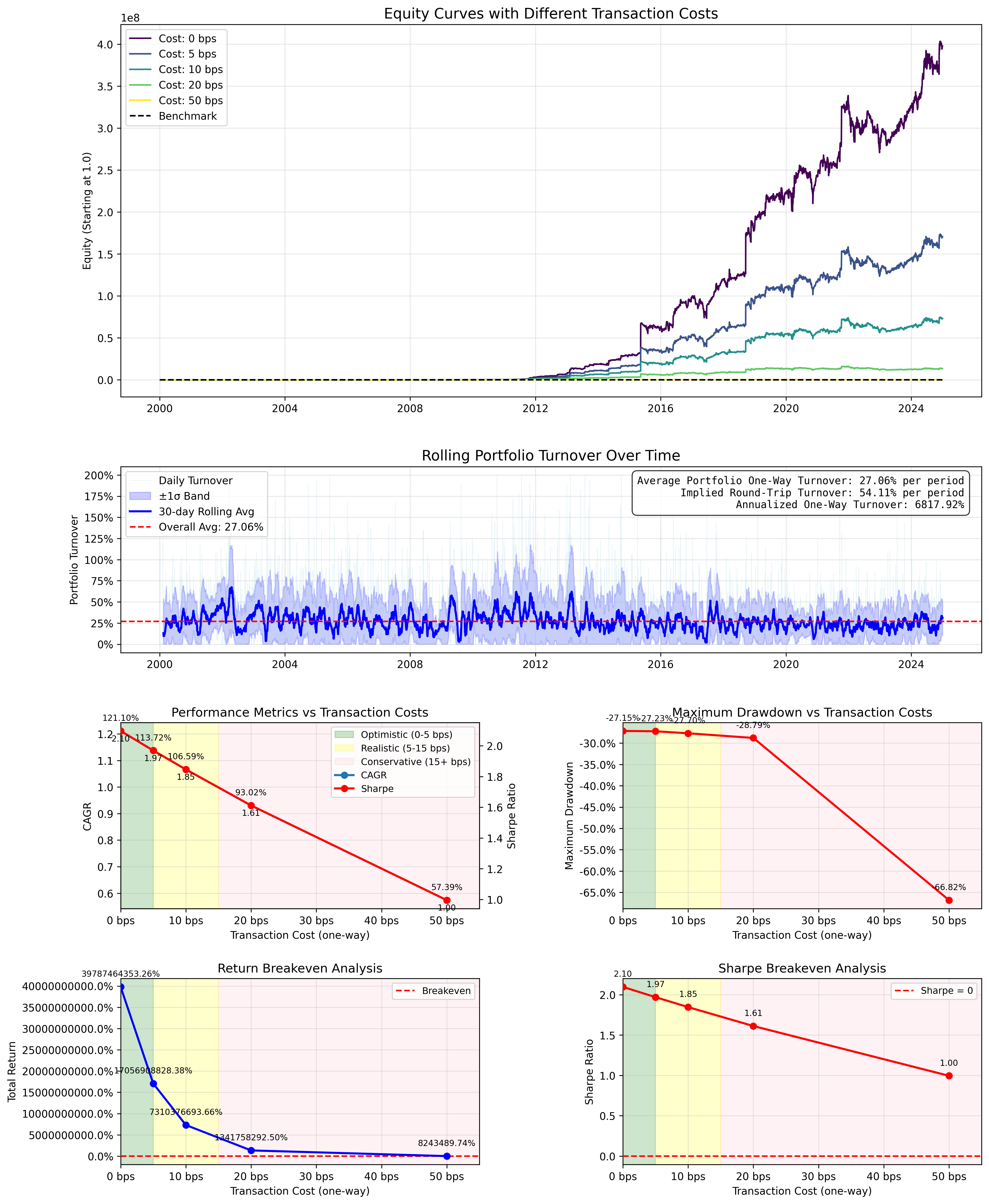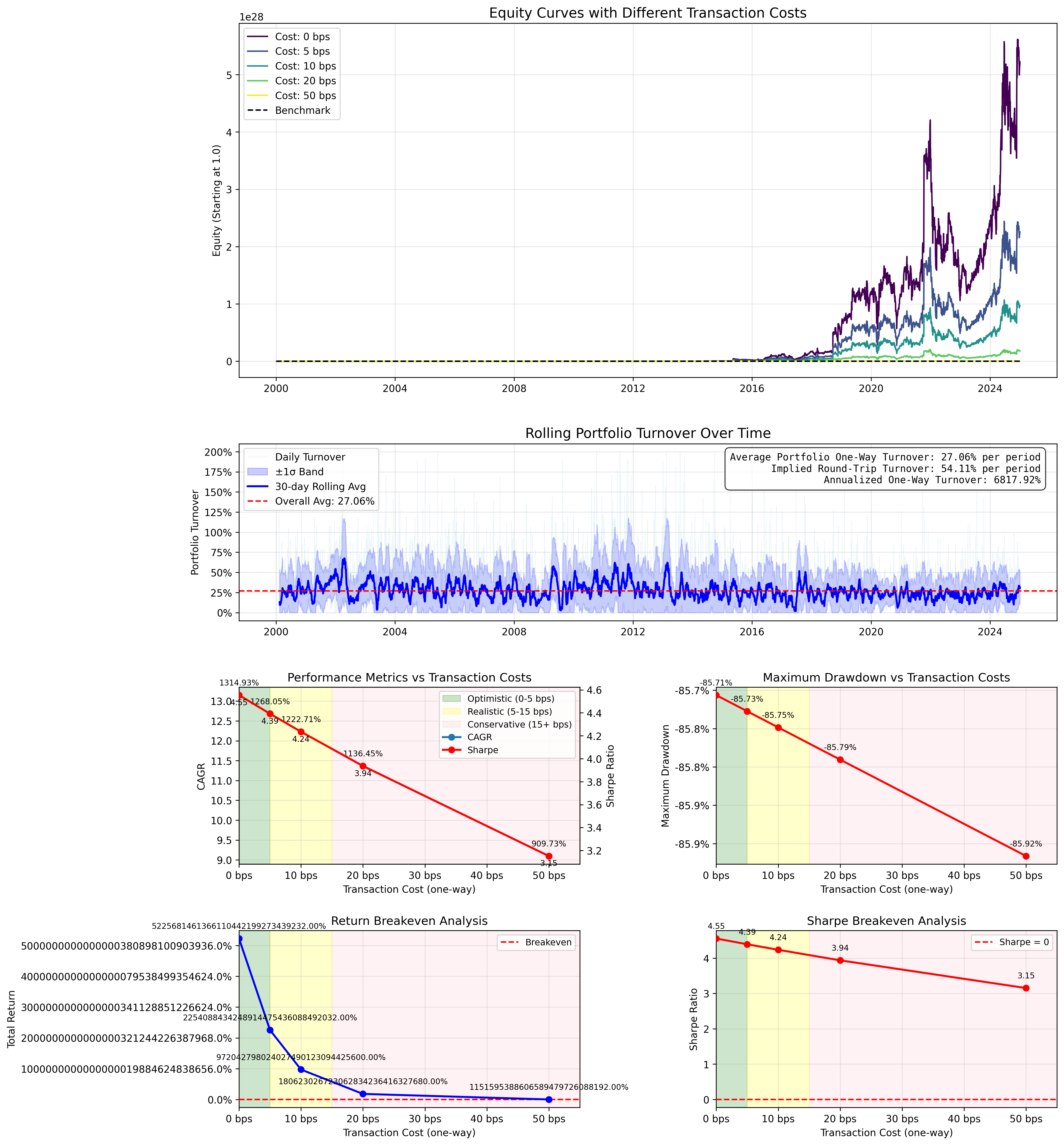 And while it’s not the theoretical numbers that I spitballed, we are still getting 106% CAGR at 10 bps transaction fees (a reasonable assumption) with -27% maximum drawdown which is well below the benchmark.