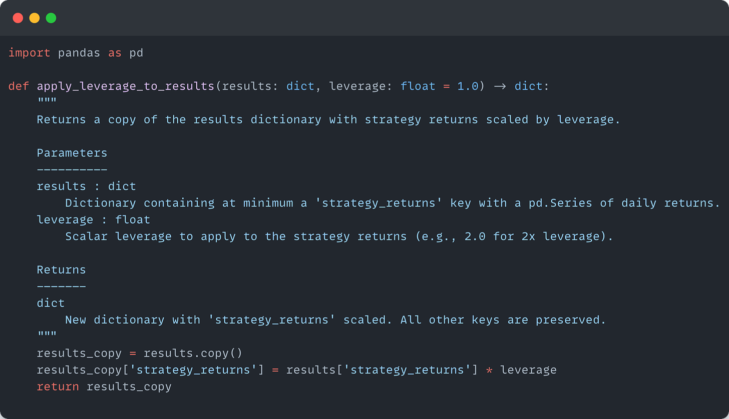 This is the best of both worlds- stomach-able drawdowns with still well above average returns. Thus, I wrote a snippet to modify the leverage of our results from the strategy: