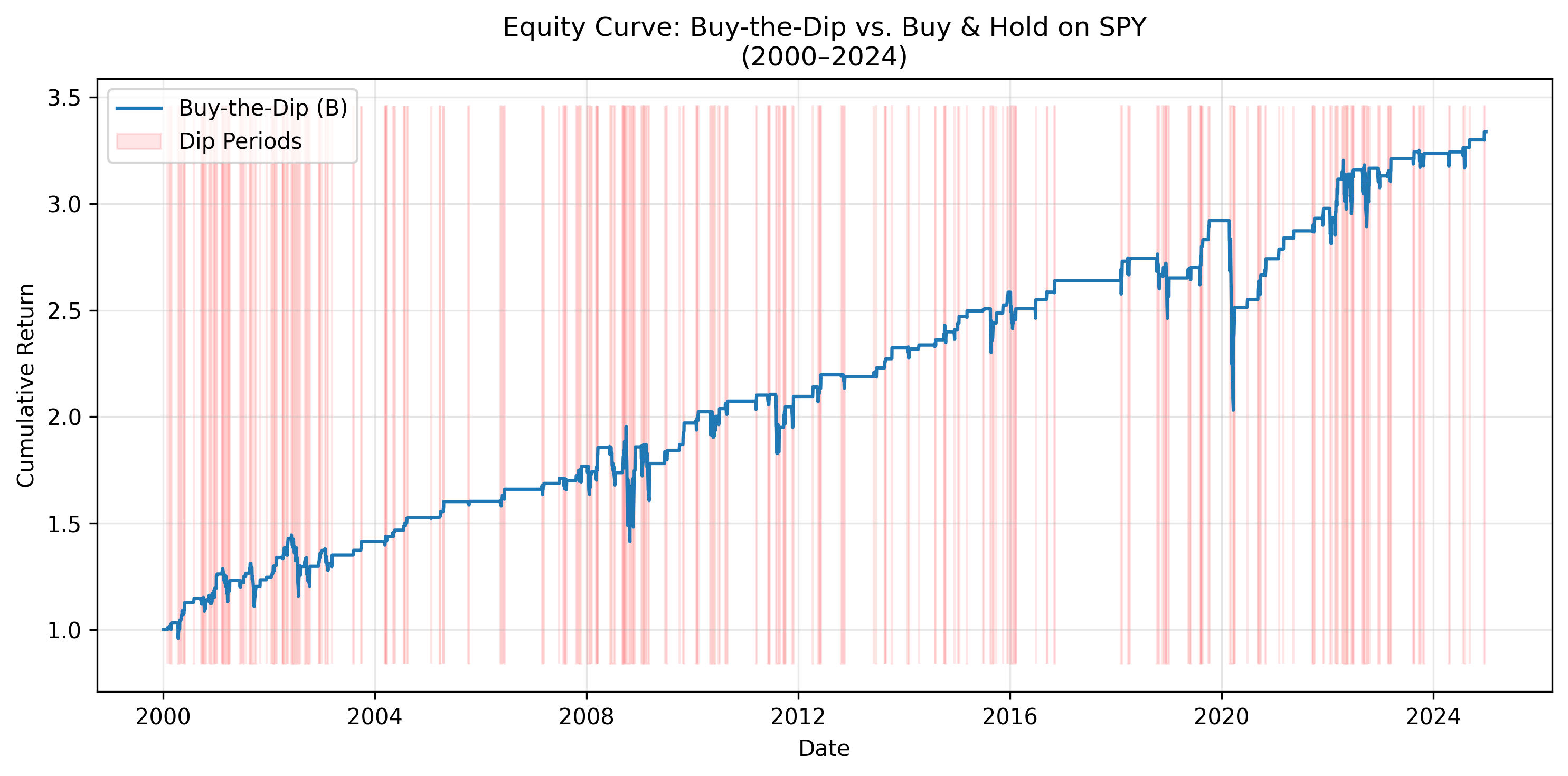Let’s take a real world example: let’s buy and hold SPY for 1 day whenever the price dips 2% or move below the 20-day moving average.