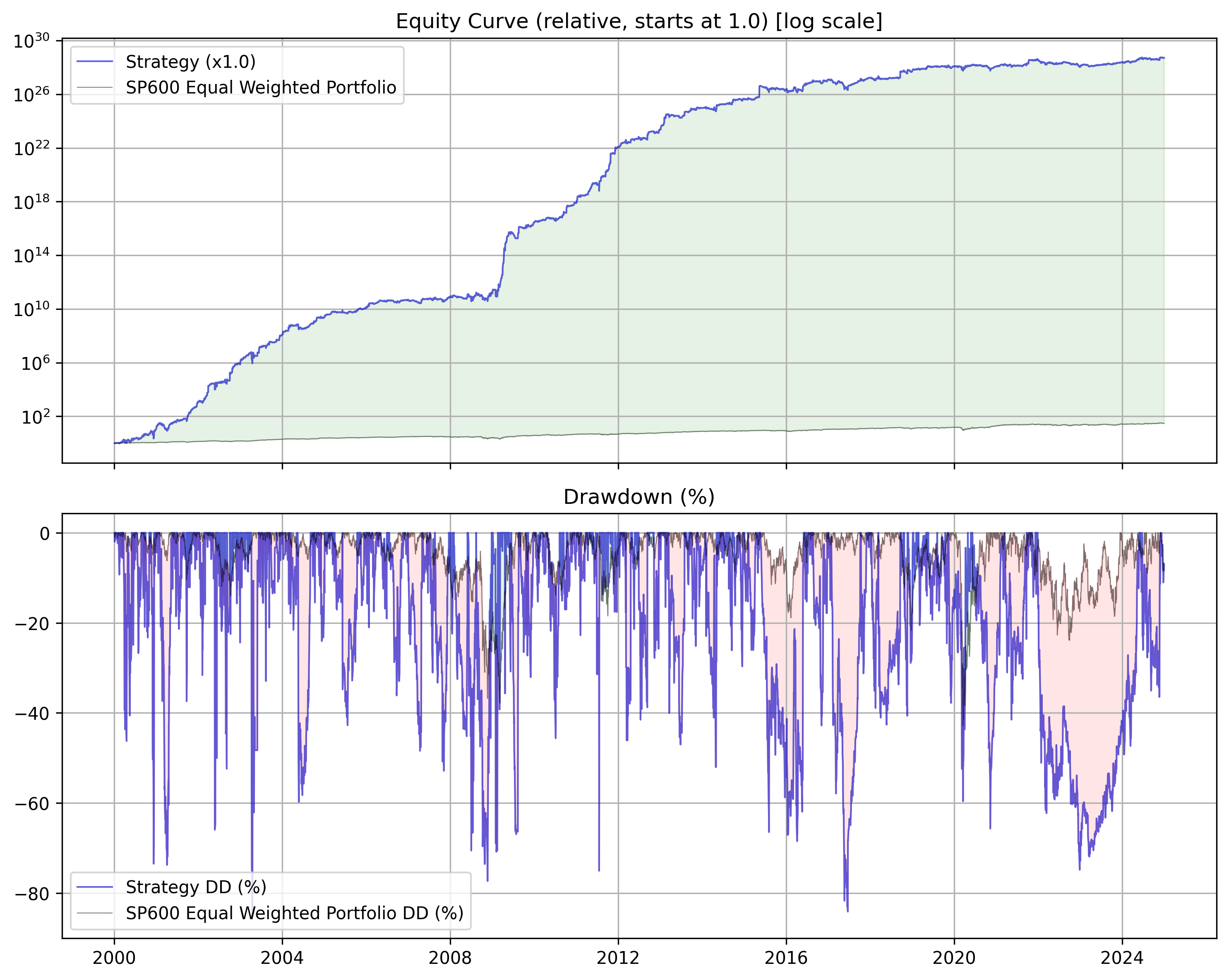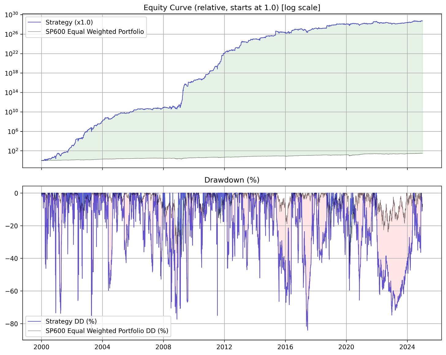 Yes, you’re seeing that correctly. That is 10 to the 30th power, or 10 with 30 zeros after it in total returns. So I guess you could say this strategy works extremely well. However, the drawdowns are extremely painful regularly passing -75% for prolonged periods of time. And, transaction fees take out their fair share out of the performance.
