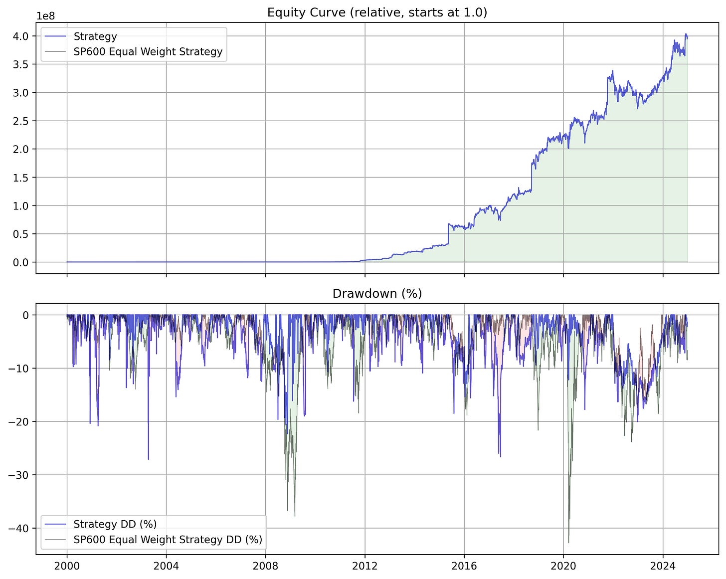 I coded this strategy, faithful to the paper, in my portwine open-source backtesting library (available here) and ran it on the SP600 Small Cap constituents. The paper uses the NYSE, Dow Jones, and TSE, however I wanted to try something different so see if it generalized to other markets.