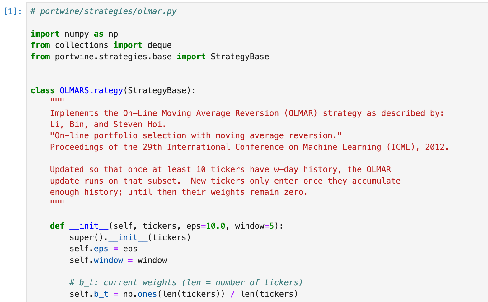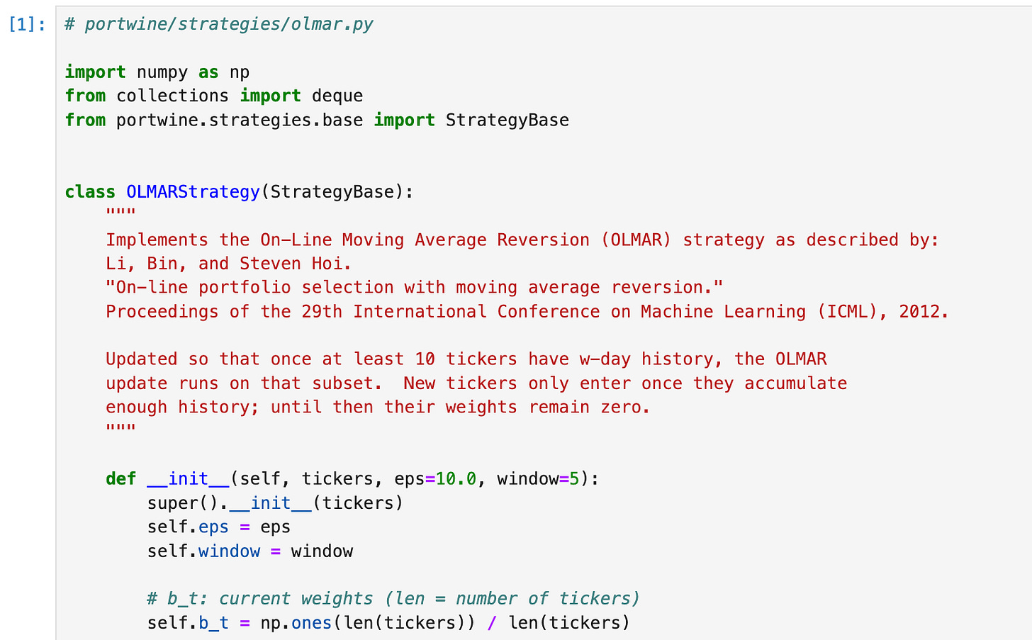 Bin Li and Steven Hoi out of Nanyang Technological University in Singapore devised this online portfolio selection system that takes exactly this factor into account, exploiting assets’ tendencies to revert back to their moving averages (hence the name). They outlined their system in a paper titled On-Line Portfolio Selection with Moving Average Reversion back in 2012 and I encourage you all to check it out. Li and Hoi’s work in online portfolio selection in general is top tier.